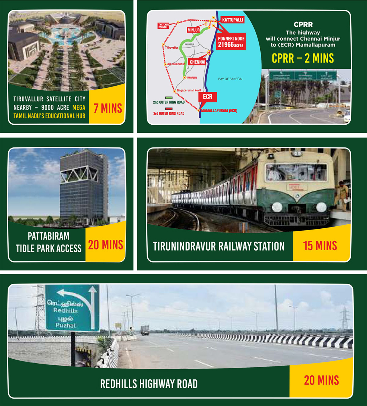 What makes Sanjeevi Nagar truly stand out is its strategic location. It is situated close to the upcoming Tiruvallur Satellite City (also known as Tiruvallur Knowledge City), a massive 9,000-acre government-backed development poised to become a major hub. The project also offers easy access to the Chennai Peripheral Ring Road (CPRR), Pattabiram TIDEL Park, and Tiruninravur Railway Station — ensuring excellent connectivity and future appreciation potential.